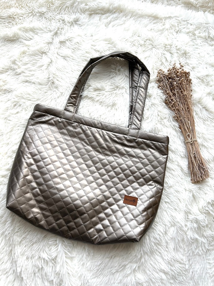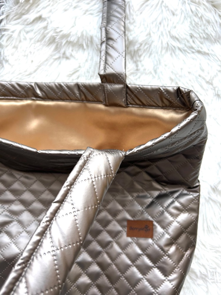 - velká praktická taška přes rameno ušitá z metalického proševu, podšitá lesklým saténem, vyztužená